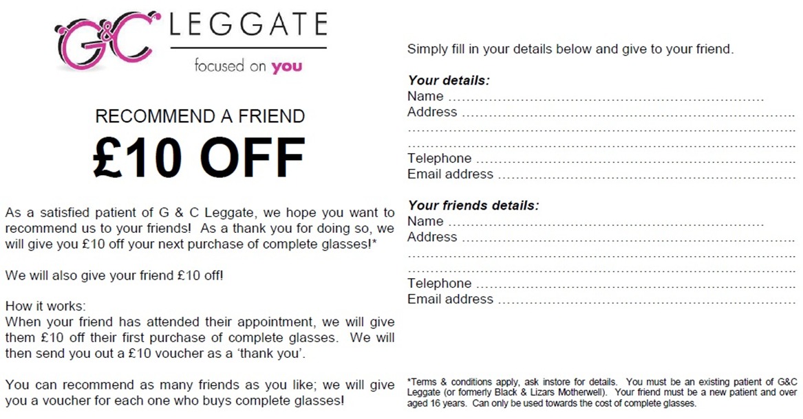 As a satisfied patient of G & C Leggate, we hope you want to recommend us to your friends! As a thank you for doing so, we will give you £10 off your next purchase of complete glasses!*